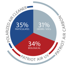 Airborne contaminants are divided into thirds. Patriot PACs (Polarized Air Cleaners) are effective against particulates, like dust and smoke. Patriot IAQ is proven to safely reduce the other two thirds (Odors/VOCs & Biological) that are inside the air system and throughout the home. Since Patriot IAQ installs directly into the central air system, the air is purified and circulated throughout the whole home, so there is no need for individual room air purifiers! Patriot IAQ™ effectively disintegrates captured contaminants, leaving only harmless water vapor and CO₂ which are released back into the air. This process leaves the carbon cells clean so they never fill up or need to be replaced. The result is clean, odor-free air throughout the home.