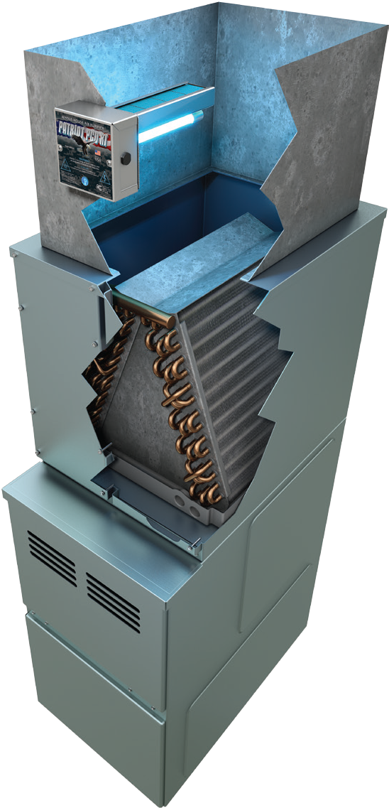 Patriot UV keeps your AC coils free of mold and improves indoor air quality throughout the home. Mold on cooling coils robs the air system of efficiency by clogging up the hundreds of fine metal plates that make up the coils. Patriot UV uses germicidal UV-C light to sterilize mold and other microbes. The result is a significantly improved air system, efficiency, and longevity. Patriot UV also kills germs, bacteria, viruses, and allergens in the air as it passes through the air system resulting in healthier indoor air for your family. There are several models to choose from, your HVAC contractor will help you select the right one.